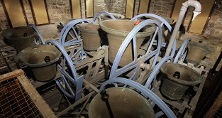 The bells are mounted on bearings with a wooden wheel which allows them to be swung through a full 360° by a bell ringer in the ringing room below. There is a clapper inside each bell which strikes the lip each time the bell rotates. This is what causes the bell to sound.